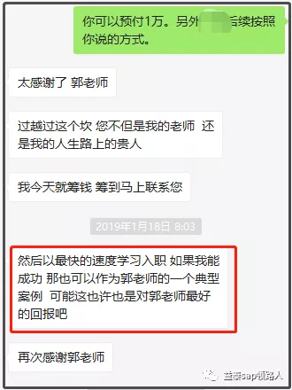 我详细向他介绍了我的培训,也也给他展示我过去的邮件中所培训学员的各种薪水待遇情况,他对我的培训很接受。但是问题的关键是,他平常没有什么私房钱。所有的资金都是由他太太每月发放,预算很严格。他也尝试过和他太太说,现在遇到了一个不错的老师,希望重新再次参加一次培训。当时的他的意思大致是,他一旦提及SAP,她太太就会说,你这辈子不要再提SAP了。这确实是一个很糟糕的情况。