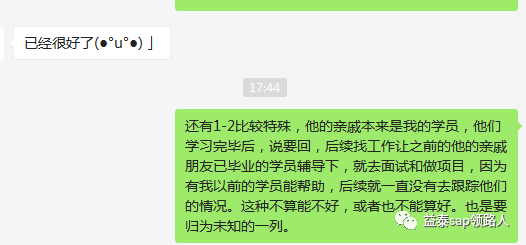 5. 以下提到的目前还不是很好的例子,其实有部分是暂时的,非学习原因暂时没有学习的,可以等待一段时间继续复习学习,也有可能重新获得很好的SAP领域工作。另外是暂时遇到的项目困难,甚至有一位一天都没有耽误,9月30日他从第一家甲方离职,10月8日到另外一家甲方入职,他在国庆假期找到第二家的工作机会,2个月后自己感觉能力上来之后,又找了900元每人天的自由顾问工作,达到了接近1.9万税后月薪的工作,这也是很好的最终结果了。