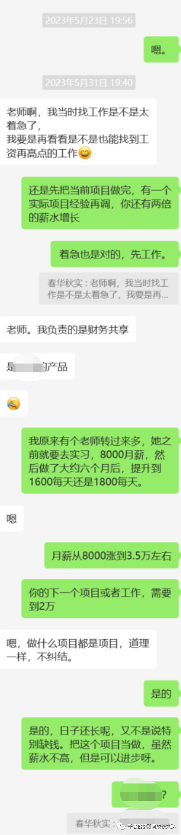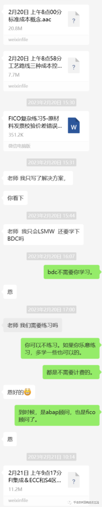 Johnson74的SAP学习之路历时6年。2012年左右参加过一个FICO培训,但是没有成功入行,但是2017年,我们联系,我希望他来学习SAP BCS,但是因为要支付学费1万元,他感觉对他有难度,工资卡都在老婆手里,实在没有自己能支配的钱,放弃,学半个月,安排他进入SAP BCS项目,人天单价大约1500元每天,他还是最终放弃了。2019年Johnson74最终决定来学习,因为他所在的公司人员优化导致他没有工作,不得不再来学习,学习SAP SD模块,第一份工作为浙江物产集团做SAP SD的运维,人天单价1300元每天,薪水比他裁员前大约6000元的月薪提高至少4倍,第二个项目到中国神华工作,真的是感谢裁员。